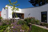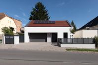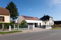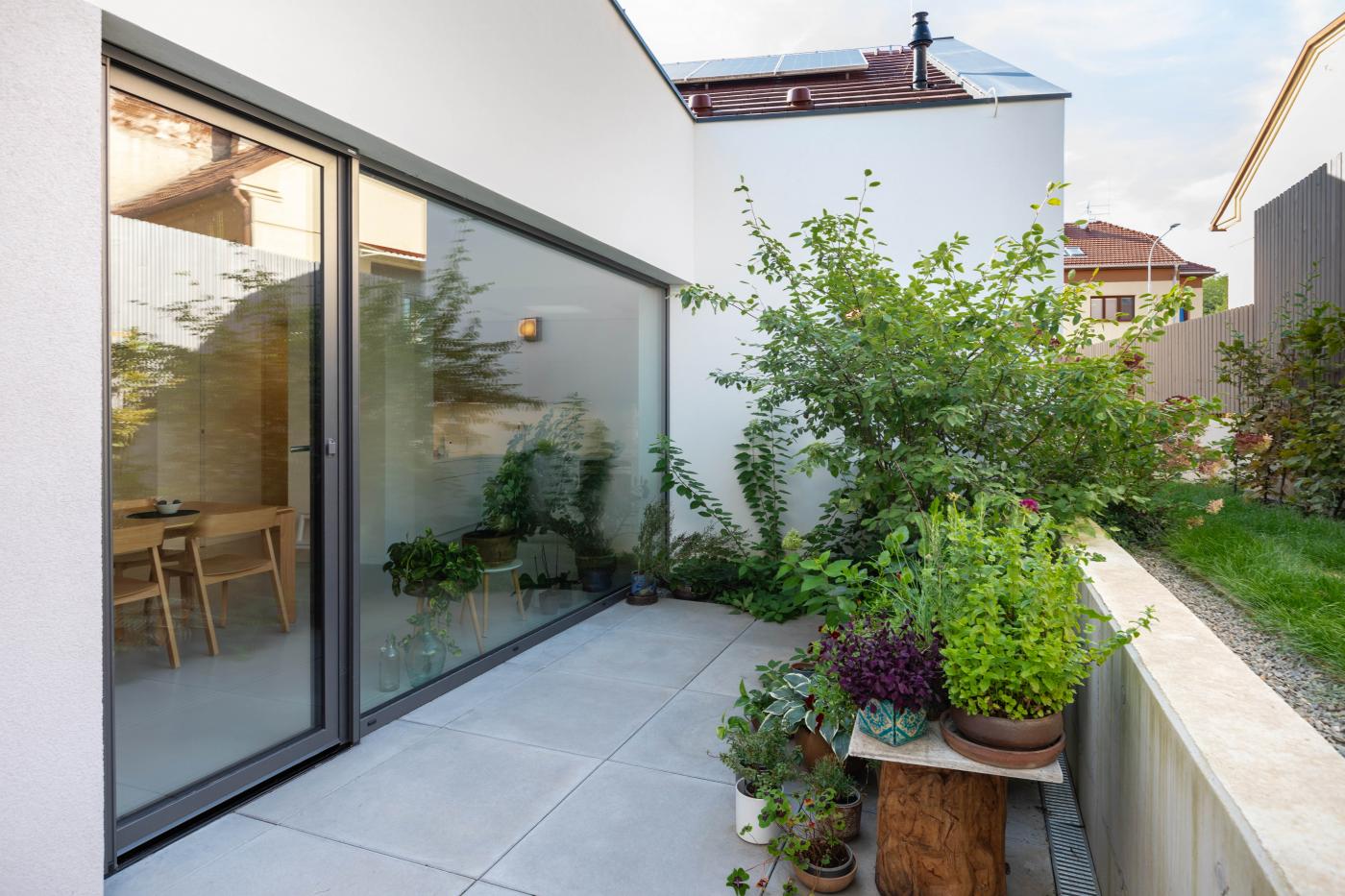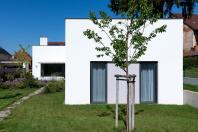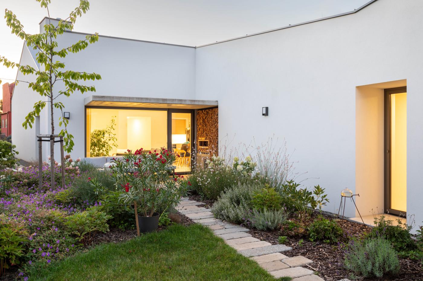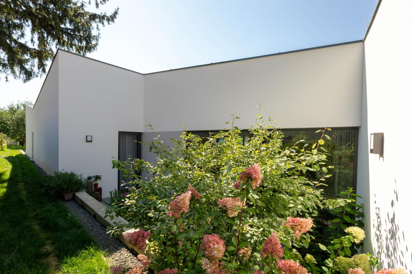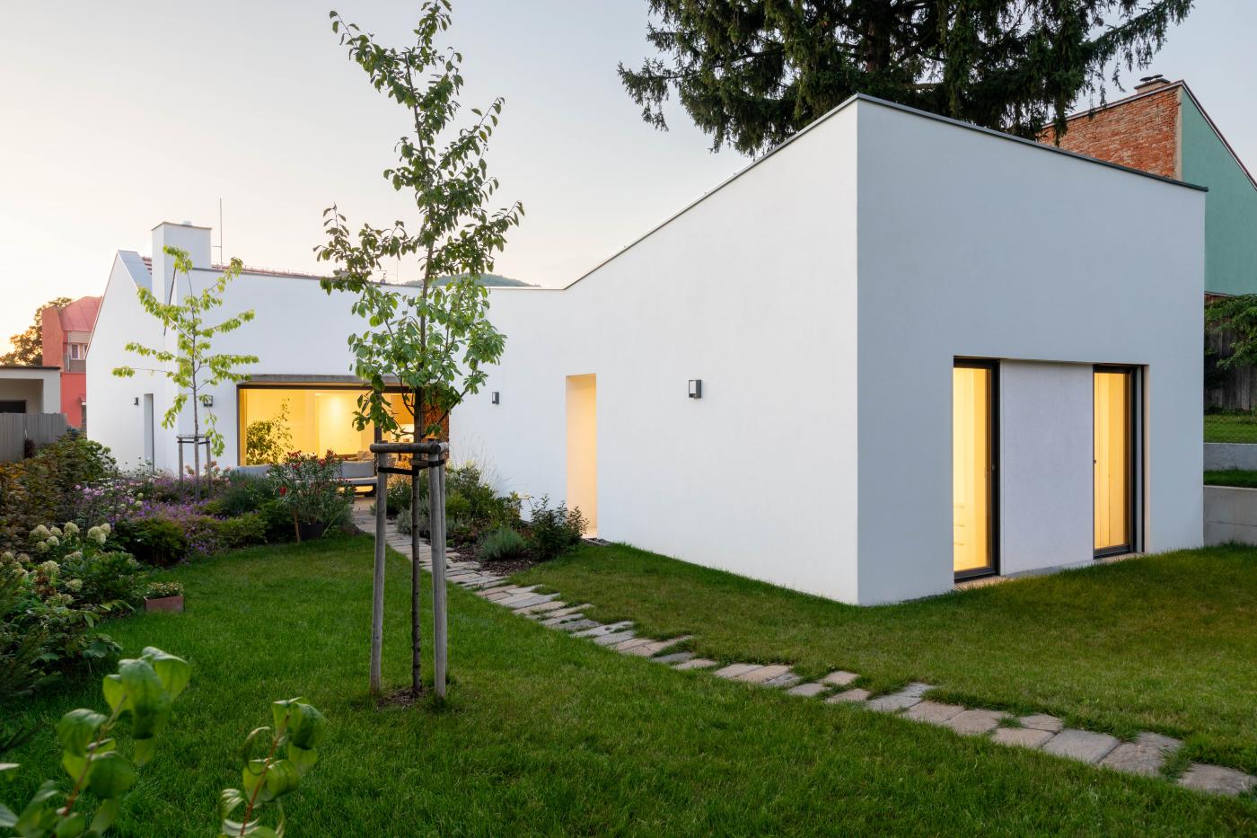 Objekt má střízlivě komponované fasády, které odrážejí funkční využití interiérových prostor. Všechny okenní otvory jsou navrženy bez parapetů, mimo jiné za účelem maximálního propojení interiéru domu se zahradou. Materiálové ztvárnění je v bílé omítce, s hliníkovými rámy oken a dveřmi. Plasticky ustupující části hmoty domu jsou zvýrazněny šedou škrábanou omítkou. Sedlová střecha uličního objemu má krytinu z tradiční pálené červené tašky, navazuje tak na charakter okolní zástavby. Pultové střechy směrem do zahrady jsou vegetační s extenzivní výsadbou suchomilných rostlin.