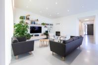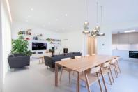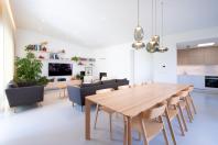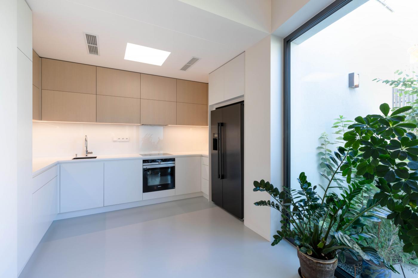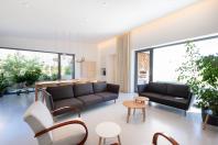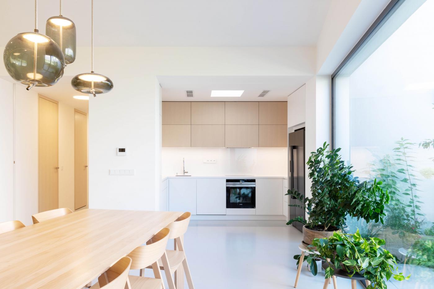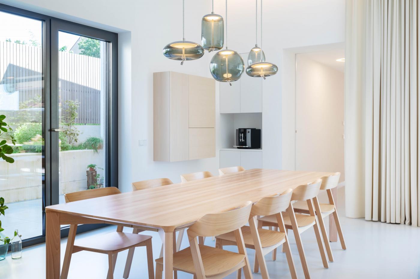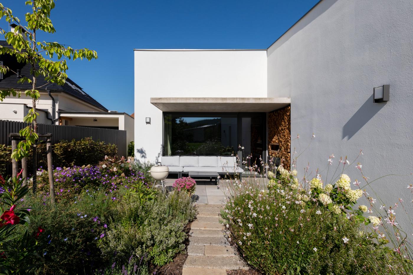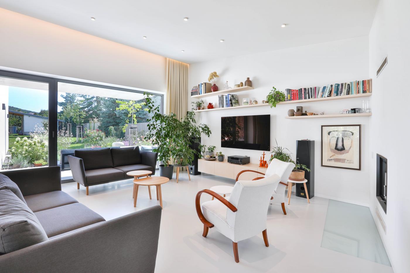 Objekt má střízlivě komponované fasády, které odrážejí funkční využití interiérových prostor. Všechny okenní otvory jsou navrženy bez parapetů, mimo jiné za účelem maximálního propojení interiéru domu se zahradou. Materiálové ztvárnění je v bílé omítce, s hliníkovými rámy oken a dveřmi. Plasticky ustupující části hmoty domu jsou zvýrazněny šedou škrábanou omítkou. Sedlová střecha uličního objemu má krytinu z tradiční pálené červené tašky, navazuje tak na charakter okolní zástavby. Pultové střechy směrem do zahrady jsou vegetační s extenzivní výsadbou suchomilných rostlin.