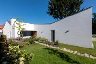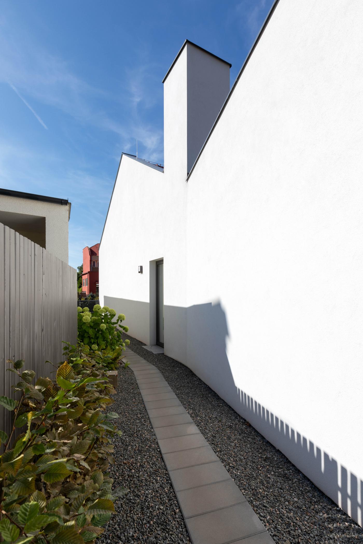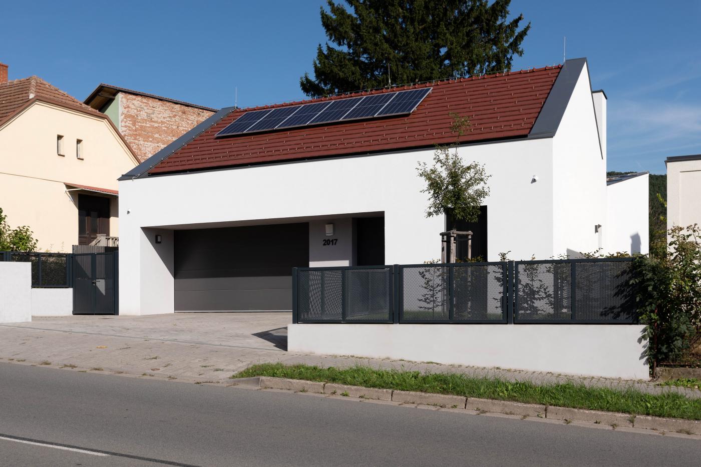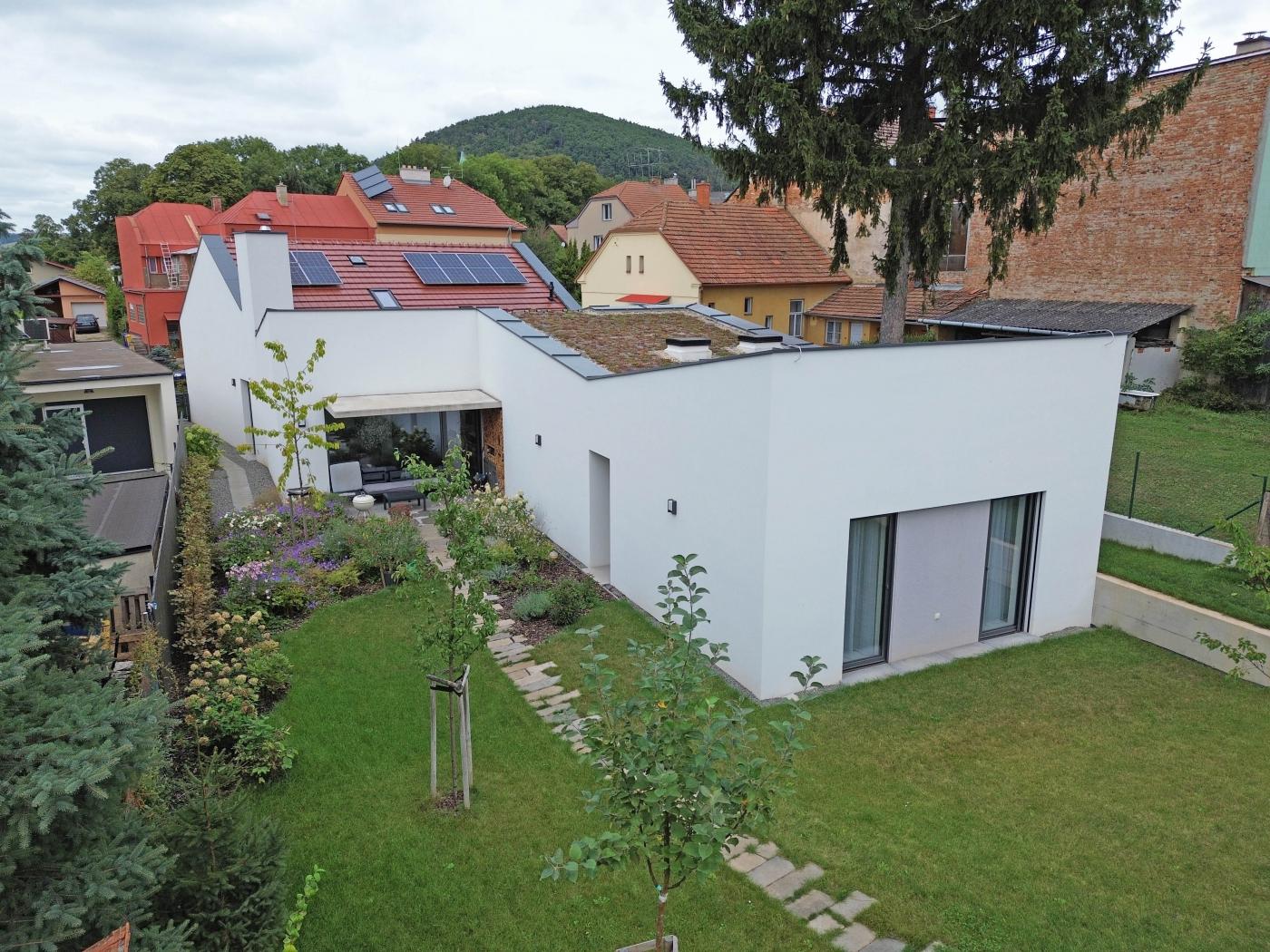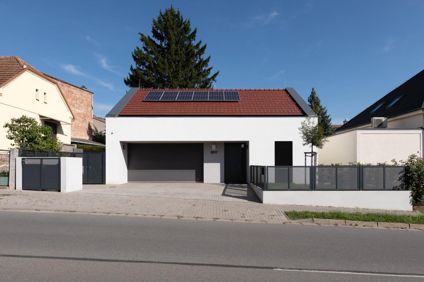Rodinný dům reaguje jak na tvar parcely a její orientaci vůči světovým stranám, tak na charakter okolní zástavby. Respektuje stávající stavební čáru v ulici, do níž je orientována hmota obdélníkového půdorysu se sedlovou střechou. Na ni navazují dva oproti sobě navzájem posunuté objemy s pultovými střechami se společným hřebenem. Celkový objem domu je tak rozdělen nejen dle svého funkčního využití (provozní zázemí - společný obytný prostor - ložnicová část), posunem hmot také vytváří intimní venkovní prostory (dvorek, terasa) pro své obyvatele. V neposlední řadě je tímto členěním dosaženo adekvátního měřítka domu v kontextu okolí. Zvolený způsob zastřešení objektu pak jednotlivé hmoty opět propojuje, vytváří kontinuální střechu, plynoucí ve směru podélné osy parcely. Hloubka parcely je výchozím motivem pro uspořádání rodinného domu – jeho jednotlivé prostory a objemy jsou koncipovány kolem podélné osy, která prochází objektem a pokračuje dále do exteriéru. Zahradou pak pokračuje chodníkem mezi stávajícími vzrostlými stromy k objektu altánu se sklepem.