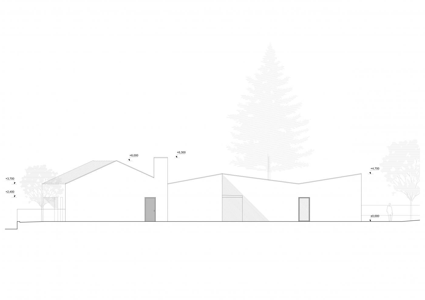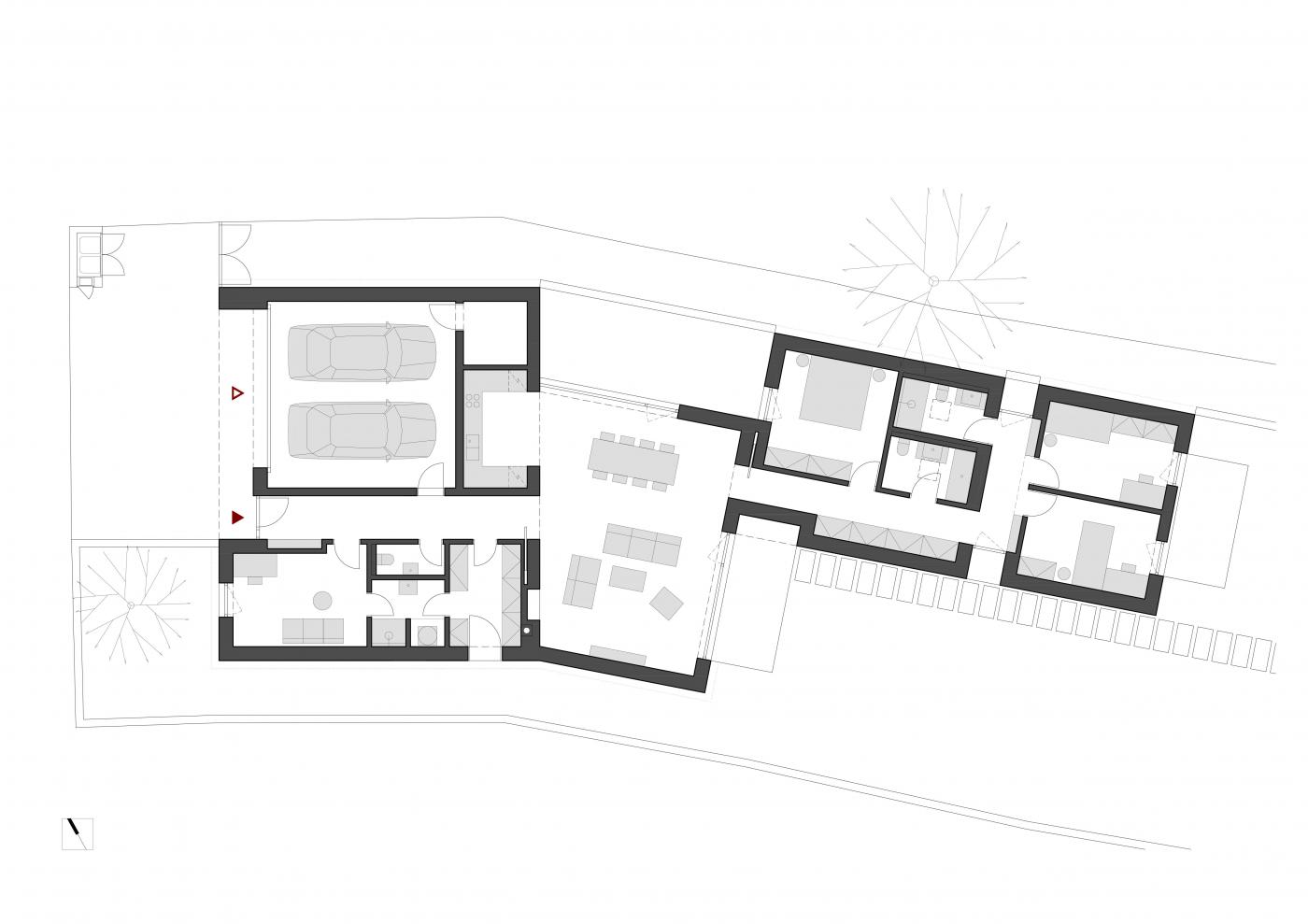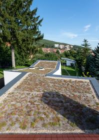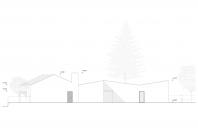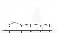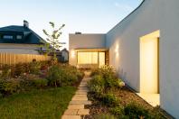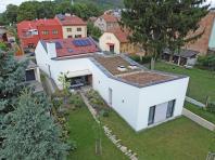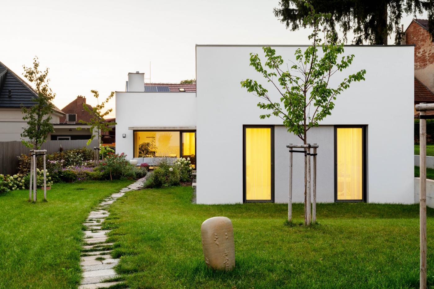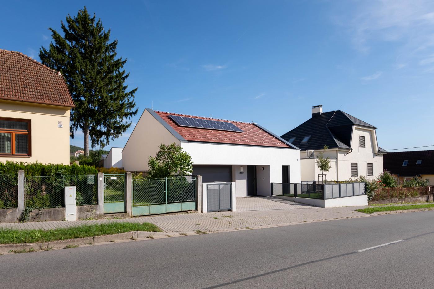 Rodinný dům reaguje jak na tvar parcely a její orientaci vůči světovým stranám, tak na charakter okolní zástavby. Respektuje stávající stavební čáru v ulici, do níž je orientována hmota obdélníkového půdorysu se sedlovou střechou. Na ni navazují dva oproti sobě navzájem posunuté objemy s pultovými střechami se společným hřebenem. Celkový objem domu je tak rozdělen nejen dle svého funkčního využití (provozní zázemí - společný obytný prostor - ložnicová část), posunem hmot také vytváří intimní venkovní prostory (dvorek, terasa) pro své obyvatele. V neposlední řadě je tímto členěním dosaženo adekvátního měřítka domu v kontextu okolí. Zvolený způsob zastřešení objektu pak jednotlivé hmoty opět propojuje, vytváří kontinuální střechu, plynoucí ve směru podélné osy parcely. Hloubka parcely je výchozím motivem pro uspořádání rodinného domu – jeho jednotlivé prostory a objemy jsou koncipovány kolem podélné osy, která prochází objektem a pokračuje dále do exteriéru. Zahradou pak pokračuje chodníkem mezi stávajícími vzrostlými stromy k objektu altánu se sklepem.
