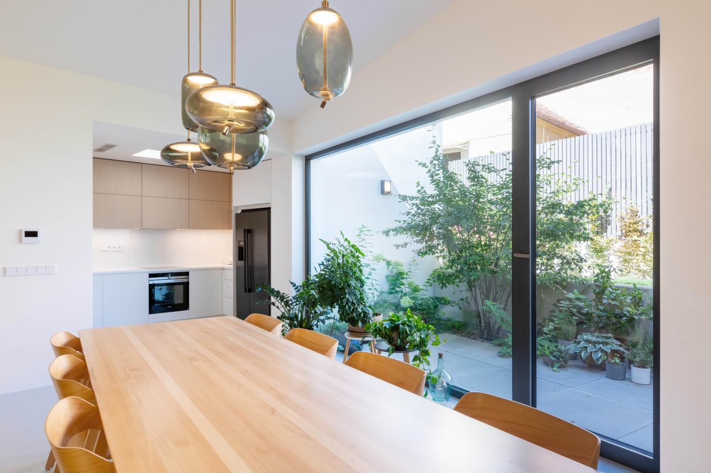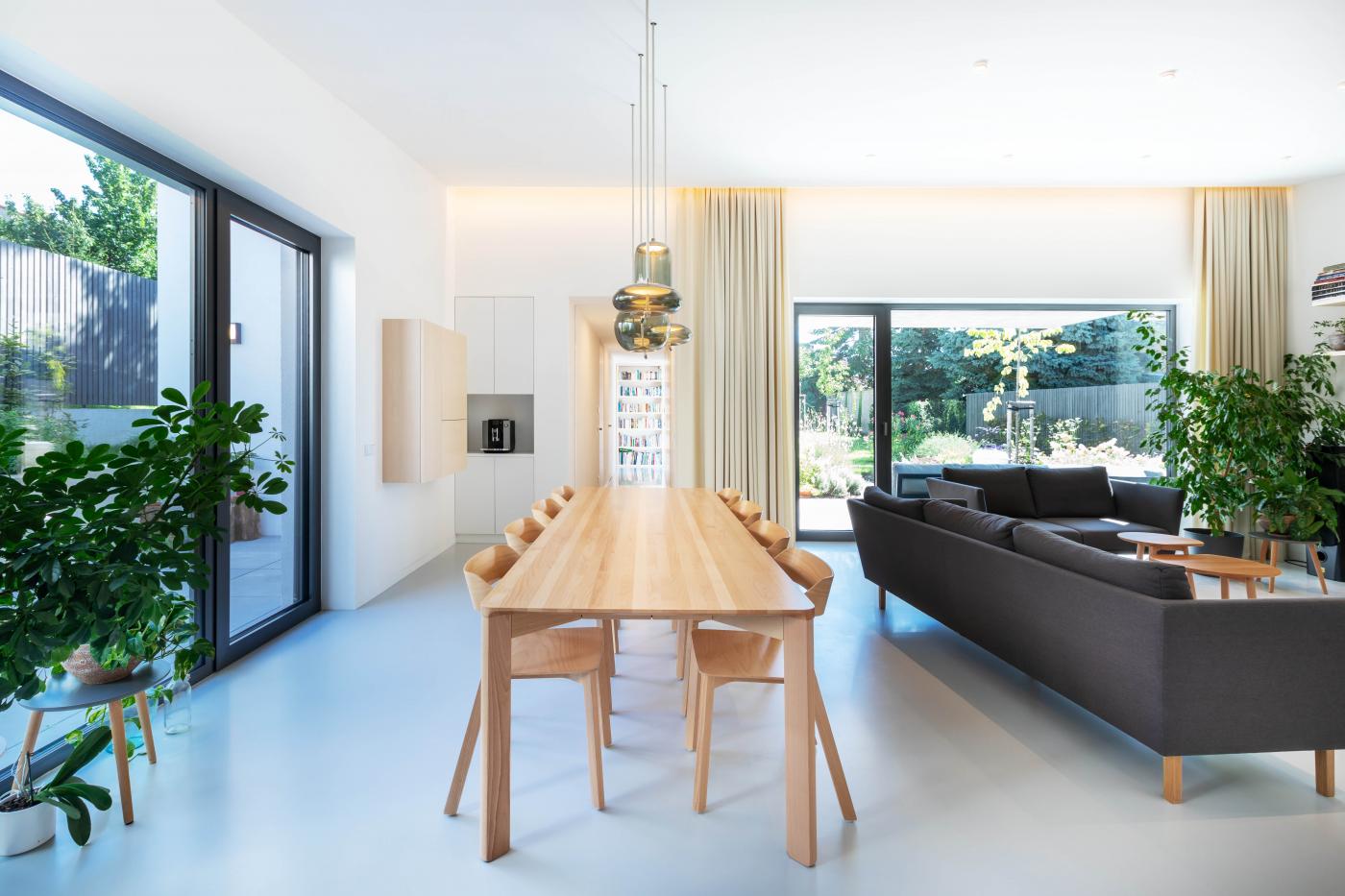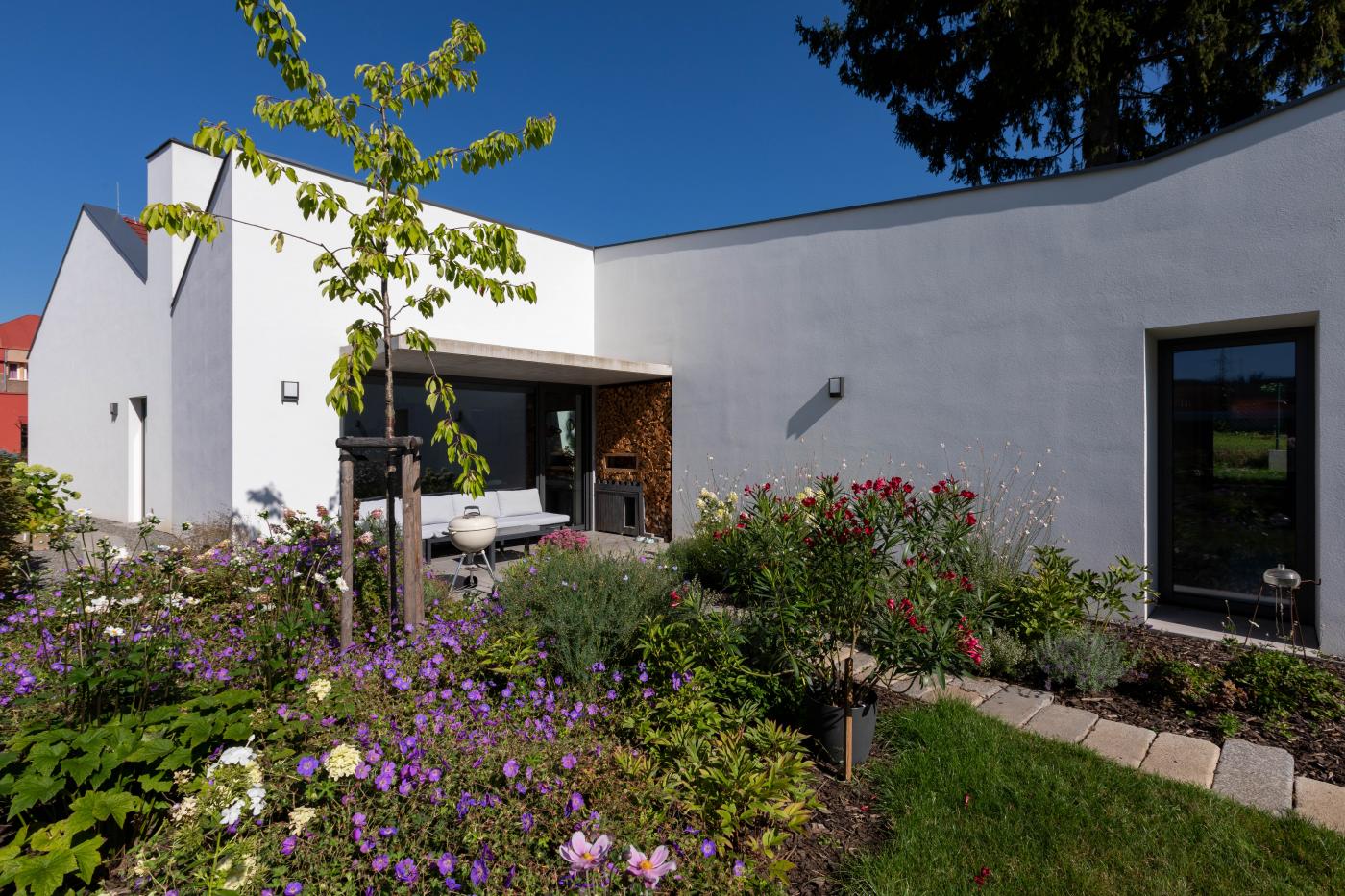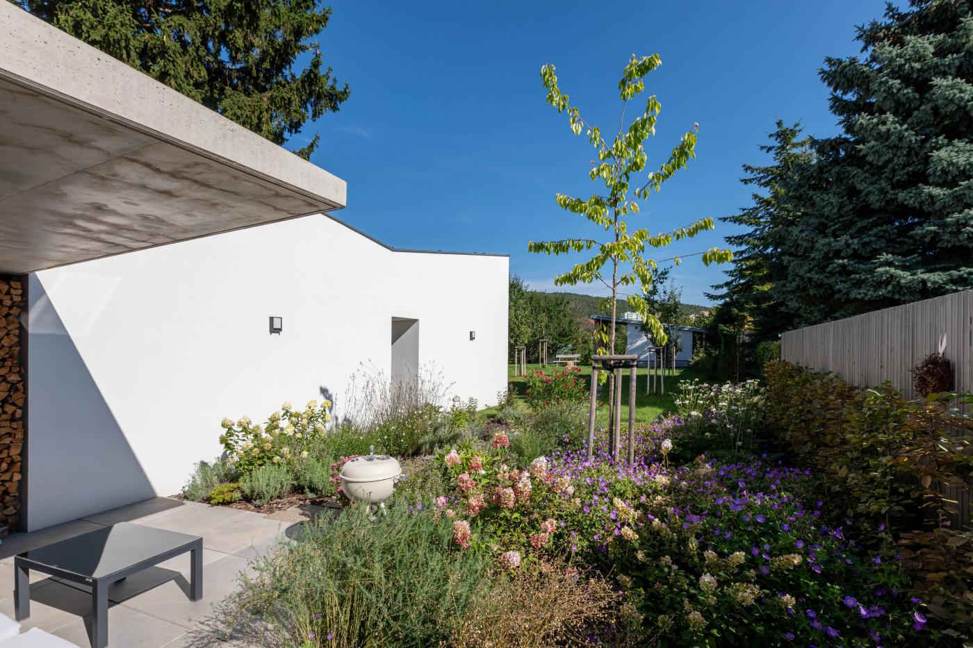 Rodinný dům reaguje jak na tvar parcely a její orientaci vůči světovým stranám, tak na charakter okolní zástavby. Respektuje stávající stavební čáru v ulici, do níž je orientována hmota obdélníkového půdorysu se sedlovou střechou. Na ni navazují dva oproti sobě navzájem posunuté objemy s pultovými střechami se společným hřebenem. Celkový objem domu je tak rozdělen nejen dle svého funkčního využití (provozní zázemí - společný obytný prostor - ložnicová část), posunem hmot také vytváří intimní venkovní prostory (dvorek, terasa) pro své obyvatele. V neposlední řadě je tímto členěním dosaženo adekvátního měřítka domu v kontextu okolí. Zvolený způsob zastřešení objektu pak jednotlivé hmoty opět propojuje, vytváří kontinuální střechu, plynoucí ve směru podélné osy parcely. Hloubka parcely je výchozím motivem pro uspořádání rodinného domu – jeho jednotlivé prostory a objemy jsou koncipovány kolem podélné osy, která prochází objektem a pokračuje dále do exteriéru. Zahradou pak pokračuje chodníkem mezi stávajícími vzrostlými stromy k objektu altánu se sklepem.