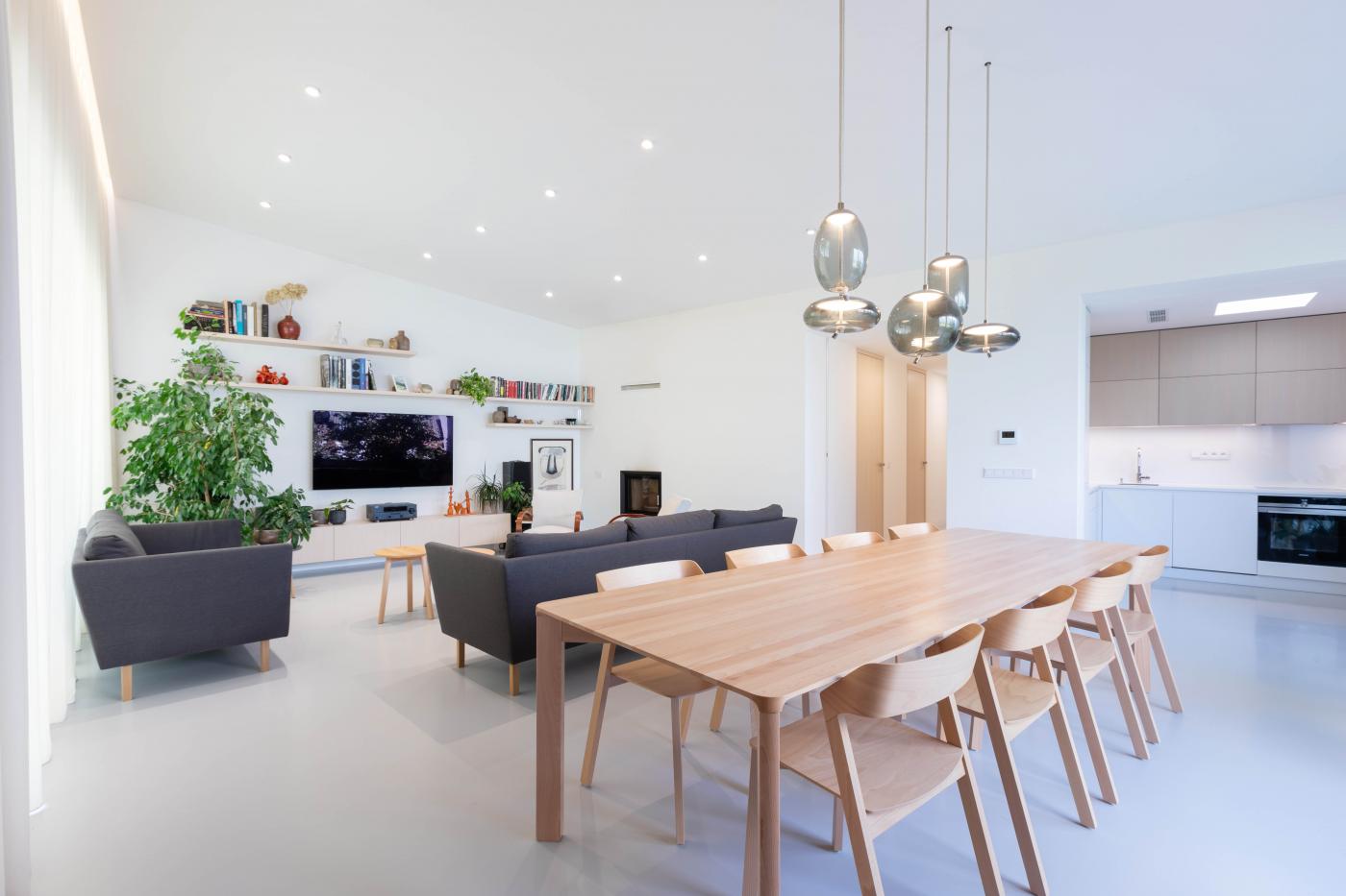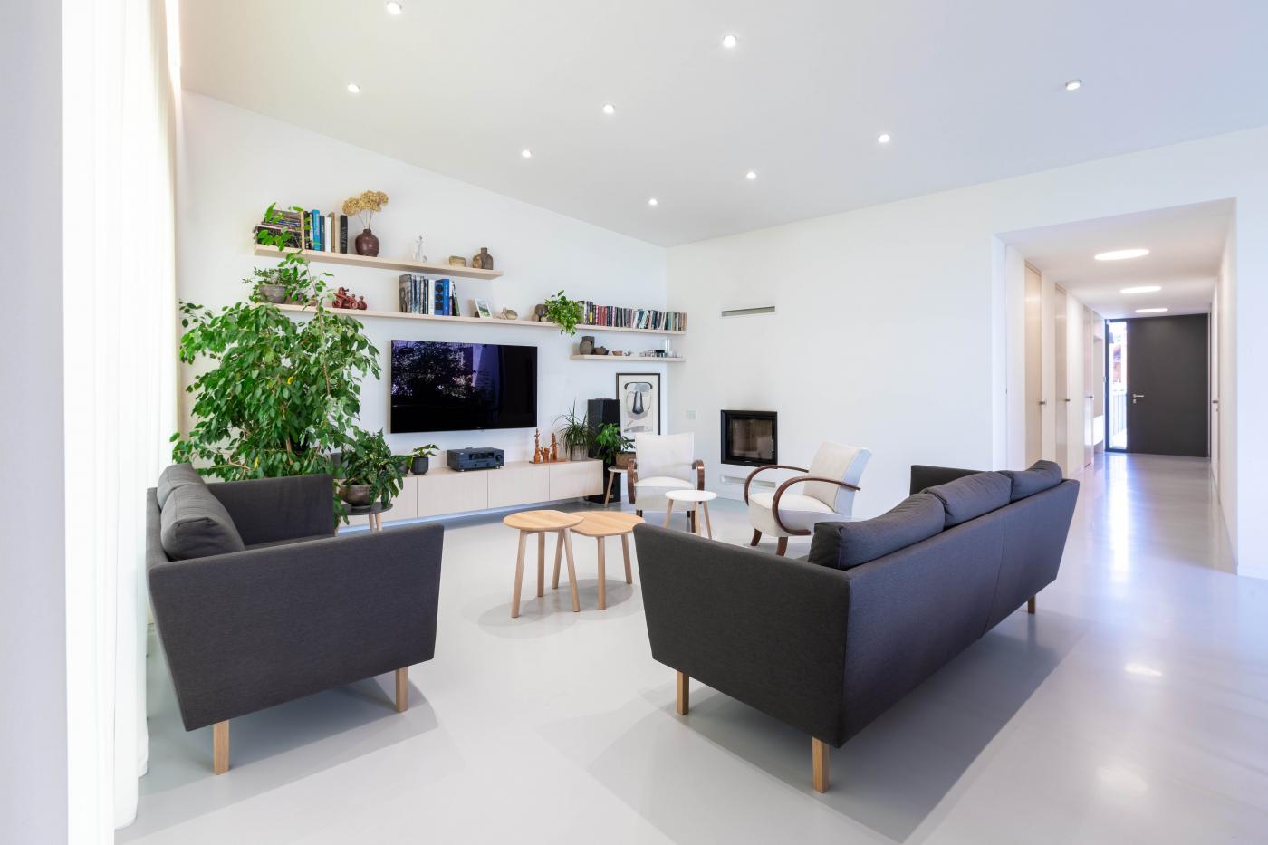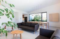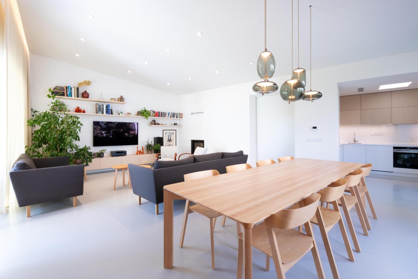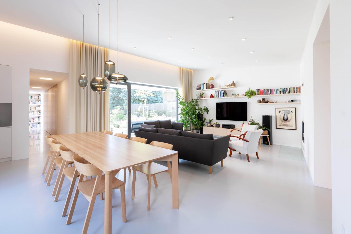 Rodinný dům reaguje jak na tvar parcely a její orientaci vůči světovým stranám, tak na charakter okolní zástavby. Respektuje stávající stavební čáru v ulici, do níž je orientována hmota obdélníkového půdorysu se sedlovou střechou. Na ni navazují dva oproti sobě navzájem posunuté objemy s pultovými střechami se společným hřebenem. Celkový objem domu je tak rozdělen nejen dle svého funkčního využití (provozní zázemí - společný obytný prostor - ložnicová část), posunem hmot také vytváří intimní venkovní prostory (dvorek, terasa) pro své obyvatele. V neposlední řadě je tímto členěním dosaženo adekvátního měřítka domu v kontextu okolí. Zvolený způsob zastřešení objektu pak jednotlivé hmoty opět propojuje, vytváří kontinuální střechu, plynoucí ve směru podélné osy parcely. Hloubka parcely je výchozím motivem pro uspořádání rodinného domu – jeho jednotlivé prostory a objemy jsou koncipovány kolem podélné osy, která prochází objektem a pokračuje dále do exteriéru. Zahradou pak pokračuje chodníkem mezi stávajícími vzrostlými stromy k objektu altánu se sklepem.