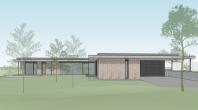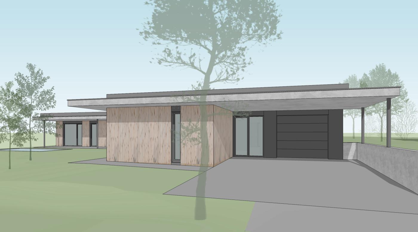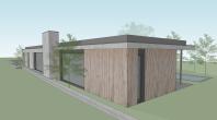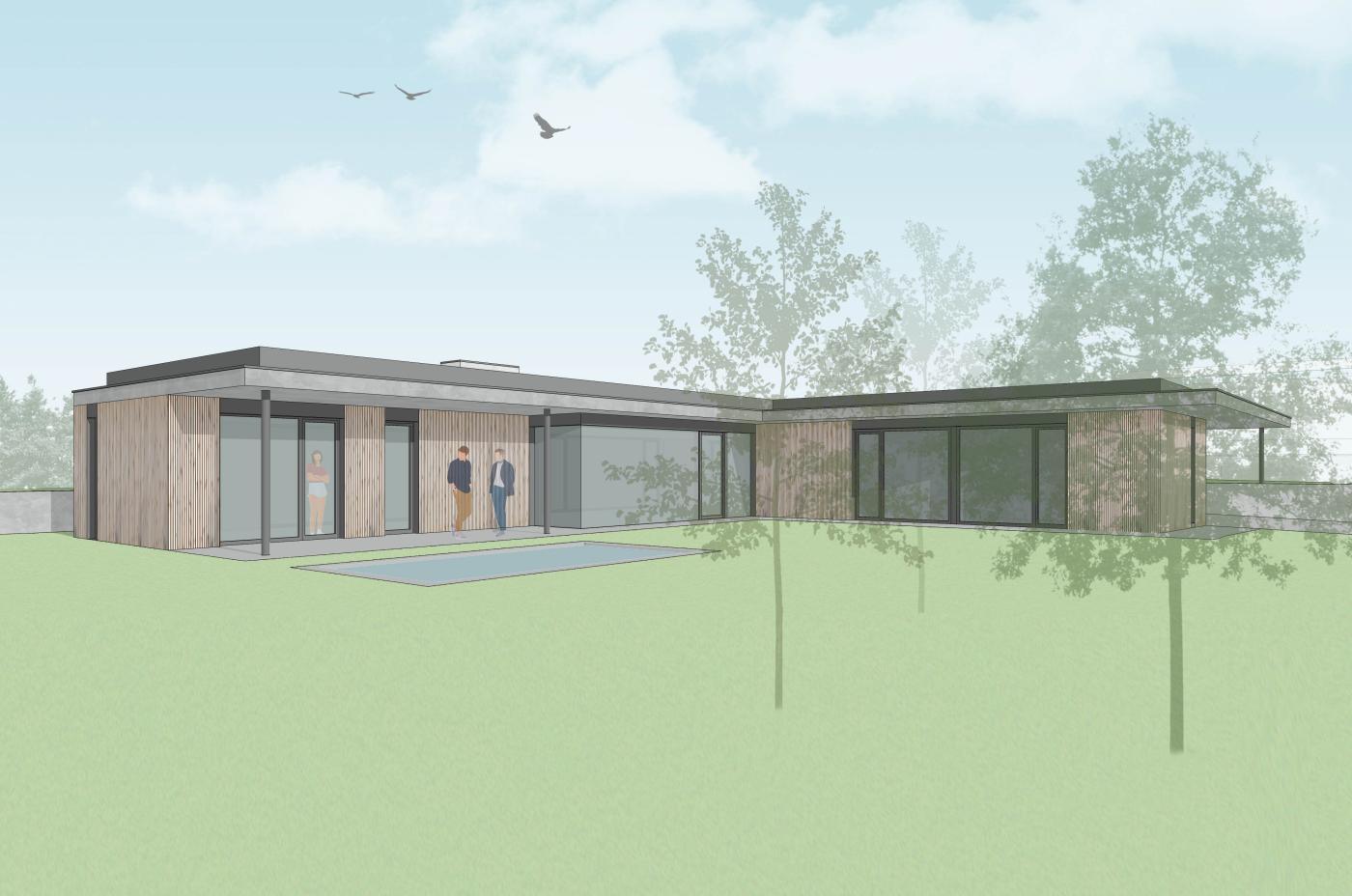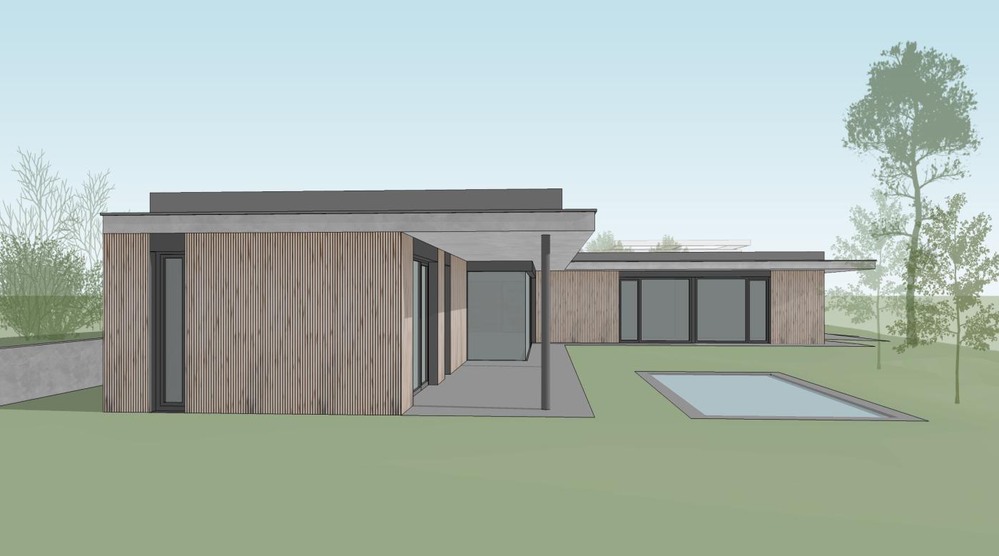 Prostorový koncept je založen na tvarování domu na L půdorysu tak, aby svou hmotou vytvořil náruč kolem hlavní zahrady a zároveň poskytl maximální soukromí a oddělení od okolních domů. Dům se otevírá na jihozápad, ve směru, kde končí zastavěné území obce a navazuje volná krajina a les. Do zahrady jsou orientovány velkými okny všechny obytné místnosti. Především hlavní obytný prostor je s exteriérem propojen dlouhou celoprosklenou stěnou a zároveň se otevírá také k severovýchodní chladnější terase, tedy je prosvětlen ze dvou protějších stran. Členění na jednotlivé provozní celky propisující se ve tvaru domu zjemňuje jeho celkové měřítko. Tvar domu je sjednocován pod jemnou linkou střechy s ustoupenou atikou a s místy výraznými přesahy, které tvoří ochoz kolem domu a zároveň přirozené stínění.